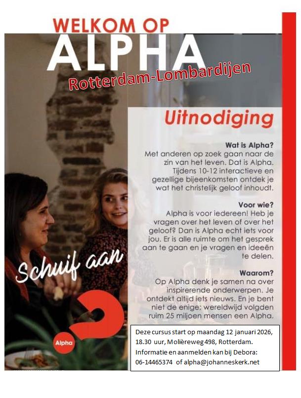 Maar info of opgeven kan via Debora Bontenbal: 0614465374 of alpha@johanneskerk.net